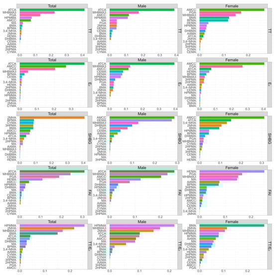 Furthermore, we found that ATCA was the main mVOC affecting testosterone, estradiol, and FAI levels in the male population, while AMCC had a major effect on SHBG levels (Figure 3). In females, BMA was the major metabolite affecting TT/E2.