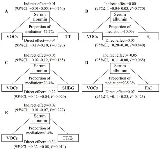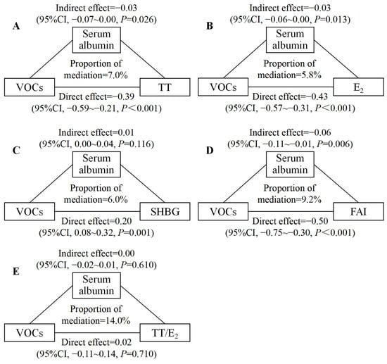 Serum albumin might play an important role in the effects of VOCs on sex hormones. Studies have confirmed that serum albumin may mediate the relationship between several endocrine-disrupting chemicals and sex hormones []. In addition, increased concentrations of metabolites of VOCs, including benzene, could lead to structural changes in serum albumin [], which might influence the regulation of sex hormones by serum albumin []. Exploring the role of serum albumin in the associations between VOCs and sex hormones could support the mechanistic exploration of the effects of VOCs on sex hormones, but studies on the mediating role of serum albumin were lacking.