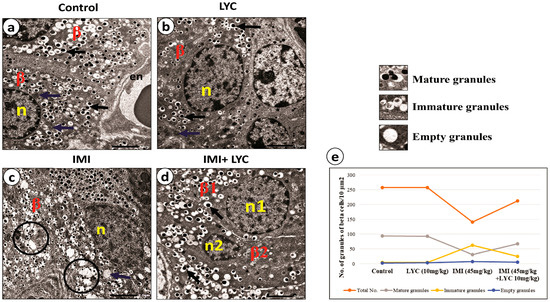 The most striking results in this study were the ultrastructural changes observed in beta cells (Figure 6a–d). The control group and LYC group showed nearly identical normal ultrastructures of beta cells, with euchromatic nuclei displaying prominent nucleoli and characteristic beta cell granules with dense cores surrounded by haloes and normal mitochondria (Figure 6a,b). Following intoxication with IMI, beta cells showed slightly shrunken nuclei and a large number of empty granules, while some other granules appeared with heterogeneous densities. The mitochondria appeared swollen (Figure 6c). LYC treatment of intoxicated rats showed apparent histological improvement (Figure 6d). Statistical analysis of the beta cell granule number (total, mature, immature, and empty) was performed (Figure 6e). There was a significant difference between the control and IMI groups for all variables. An apparent significant increase in immature granules (p = 0.000) and empty granules (p = 0.011) compared to mature granules was observed in the IMI group, indicating a cessation of insulin secretion. LYC treatment reversed the results of the IMI group. LYC appeared to restore the insulin secretion of beta cells. The results showed that mature granules were statistically (p = 0.000) the most frequent in the control and LYC groups (Figure 6e).There was a significant difference between the IMI and IMI +LYC groups for all variables except the percentage of empty granules. These results are in parallel with the biochemical results.