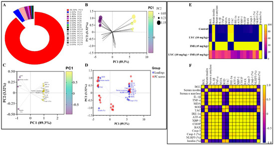 A summary of the effects of lycopene administration in IMI-induced pancreatic dysfunction. Principal component analysis (PCA) was conducted to analyse the variables (A–D). (A) The contribution of major components to overall variance was determined. (B) A PC score plot was generated, illustrating the dimensions of the different groupings based on the PC1 scale. (C) A PC loading plot was created, showcasing the dimensions of the studied variables according to the PC1 scale. (D) A PC biplot was generated, overlaying the PC scores and PC loading plots. A heatmap and correlation matrix were constructed to provide an overview of the effects of lycopene administration in IMI-induced pancreatic damage (E,F). (E) The heatmap displayed the studied parameters, indicating the impact of lycopene administration on IMI-induced pancreatic damage. (F) The correlation matrix examined the relationships between all analysed parameters.