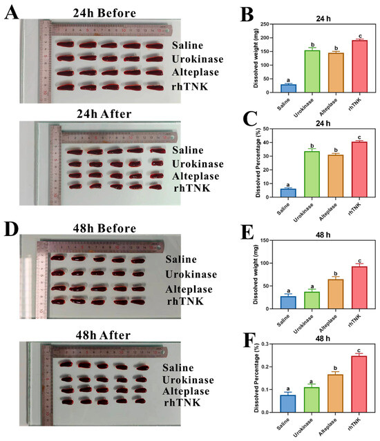 Comparison of thrombolytic effect of different thrombolytic drugs. (A) Typical images before and after thrombolytic therapy of 24 h thrombus, (B) dissolved weight of different thrombolytic drugs’ treatment of 24 h thrombus, (C) dissolved percentage of different thrombolytic drugs’ treatment of 24 h thrombus, (D) typical images before and after thrombolytic therapy of 48 h thrombus, (E) dissolved weight of different thrombolytic drugs’ treatment of 48 h thrombus, (F) dissolved percentage of different thrombolytic drugs’ treatment of 48 h thrombus. The data are presented as the mean ± SE. The different letters on the bar indicate the significant change.