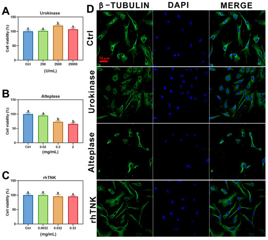 AC16 cell comparing the safety of different thrombolytic drugs. The cell viability of AC16 cells after treatment by Urokinase (A), Alteplase (B), and rhTNK (C). Cytoskeleton stained by β-TUBULIN and nuclear stained DAPI of AC 16 cells after the treatment of the three drugs; green: cytoskeleton, blue: nuclear (D). The data are presented as the mean ± SE. The different letters on the bar indicate the significant change.
