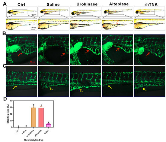 Effects of three thrombolytic drugs on blood vessels of zebrafish. (A) Three thrombolytic drugs’ injection induced zebrafish bleeding. Effects of the three thrombolytic drugs on vascular wall and vascular endothelial cells of Tg(fli1:EGFP) zebrafish, vessels in the head (B), vessels in the tail (C). The bleeding ratio after the injection of the three thrombolytic drugs (D). The data are presented as the mean ± SE. The different letters on the bar indicate the significant change.