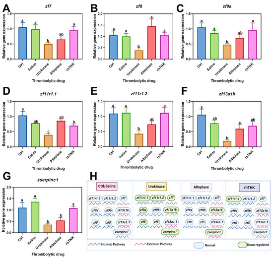 Effect of three thrombolytic drugs on coagulation pathway. The relative expression level of clotting factor was changed by three thrombolytic drugs, zf7 (A), zf8 (B), zf9a (C), zf11r1.1 (D), zf11r1.2 (E), zf13a1b (F). The relative expression level of coagulation inhibitor serpinc1 after the injection of the three thrombolytic drugs (G). (H) Diagram of mechanism of thrombolytic drugs. The data are presented as the mean ± SE. The different letters on the bar indicate the significant change.