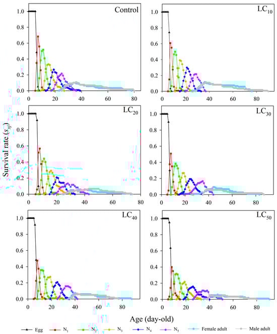 R. pedestris completed generational development under the five tested thiamethoxam concentrations (LC10~LC50). The age–stage-specific survival rates of the first-, second-, third-, fourth-, and fifth-instar nymphs and adult females and males in the LC10~LC50 treatments were shorter than those in the control treatment (Figure 1). The developmental duration of females was shorter than those of males in the control, LC10, LC20, and LC30 treatments. However, the developmental duration of males was shorter than that of females at LC40 and LC50 concentrations. These observations suggest that adult males may be more sensitive to high thiamethoxam concentrations than females and therefore more susceptible to lethality. The survival rates at each developmental stage initially increased and then decreased as the concentration increased from LC10 to LC50. The survival rates were the highest in the control treatment and the lowest in the LC50 treatment; the survival rate values were 68.33%, 51.67%, 33.33%, 26.67%, and 21.67% under the control treatment and 40.00%, 31.67%, 21.67%, 15.83%, and 10.83% under the LC50 treatment for the first-, second-, third-, fourth-, and fifth-instar nymphs, respectively. An apparent overlap in the age–stage survival curves was observed due to the individual differences in mortality under different thiamethoxam concentrations. These results indicate that thiamethoxam in the five concentrations negatively influences the survival rate and duration of the F1 generation of R. pedestris, with males being more affected than females.