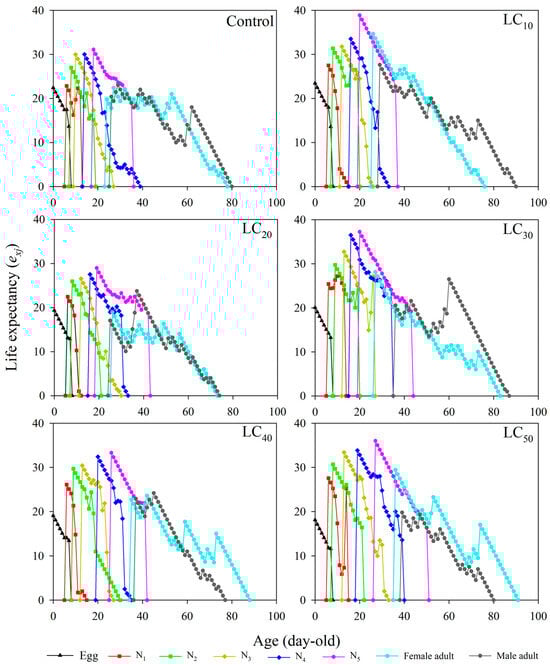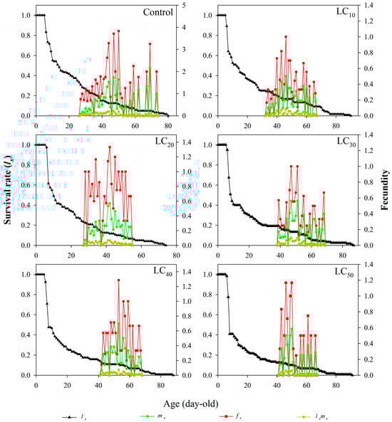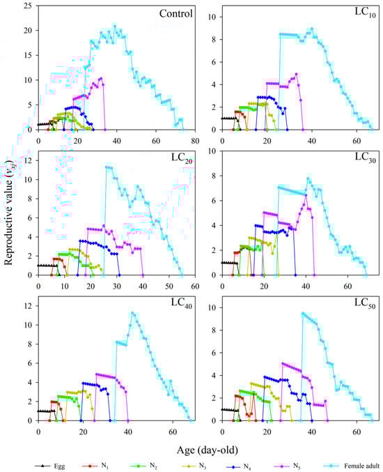 The age–stage-specific reproductive values (vxj) gradually increased with increasing age (x) and stage (j) (Figure 4). The first vxj values from female adults were detected at 24 day (CK), 26 day (LC10), 26 day (LC20), 27 day (LC30), 35 day (LC40), and 36 day (LC50). The highest vxj values of female adults occurred at 39 day (20.8419 d−1), 40 day (8.9443 d−1), 26 day (11.3011 d−1), 41 day (7.7804 d−1), 42 day (11.2579 d−1), and 36 day (9.4834 d−1) of age.