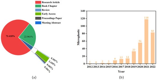 Paper type and quantity: (a) percentages of the types of the research records on microplastic biological management and mechanisms of microplastics; (b) number of studies published from 2012 to 2022 on the biological management and mechanisms of microplastics.