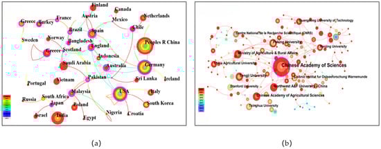 Country and institution network maps: (a) the top 20 productive countries; (b) the institutions conducting research on microplastic biological management and mechanisms of microplastics.