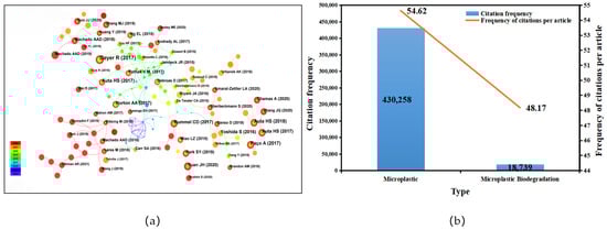 Co-reference literature analysis: (a) analysis of microplastic co-references; (b) frequency of the cited literature.