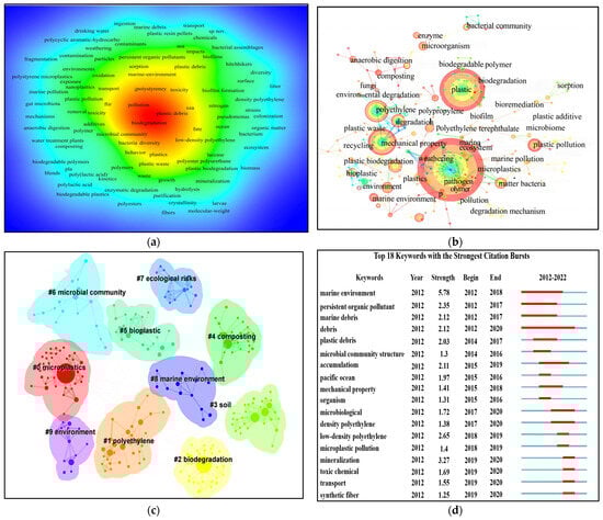 Keyword analysis: (a) visual map of the common occurrence density of keywords in the research on biological governance and mechanisms of microplastics from 2012–2022, the color of the annual cycle reflects the periods before and after the appearance of each keyword, as the color changes from purple to red, the period in which each keyword appeared becomes more recent, and vice versa; (b) network visualization map of co-occurrence keywords from 2012–2022, the color of the annual cycle reflects the periods before and after the appearance of each keyword, as the color changes from purple to red, the period in which each keyword appeared becomes more recent, and vice versa; (c) VOSvileviewer network diagram of research on biological governance and mechanisms of microplastics from 2012 to 2022, each node denotes a keyword and the keywords are clustered with different colours; (d) keywords with the strongest citation bursts, the red bars represent frequently cited keywords, while the green bars were infrequently cited keywords.