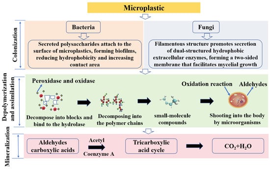 Microplastics can provide a habitat for many special microbial communities, such as microplastic-degrading bacteria, that can change the ecological function of the ecosystem and play a role in microplastic degradation []. Microplastics are polymeric substances that have existed in the environment for a long time and do not degrade easily [], remaining in the environment for a decade or longer. It has been found that some microorganisms in the ecosystem have significant degradation effects on microplastics. This includes bacteria and fungi, which can participate in the degradation of microplastics []. However, it is difficult for a single strain to completely degrade microplastics, and complexes of several types of bacteria are needed instead to be effective for the degradation of microplastics []. In addition to being widely distributed on microplastic surfaces, these functional microorganisms are also present in the digestive tract of some animals []. Whether it occurs through bacteria, fungi, or intestinal microorganisms, the main principle of microplastic biodegradation is a complete decomposition of microplastics into harmless inorganic substances through microbial metabolism. Microplastic biodegradation generally consists of three steps: First, microorganisms colonize the surface of the microplastic and form small particles. Second, cleavage occurs under the action of enzymes to form small molecular compounds. Third, the microplastics undergo mineralization and decomposition into CO2 and H2O. Bacteria have faster growth and reproduction, strong genetic manipulation, and clear metabolic pathways, which make it easier to elucidate the degradation process and mechanism in studies. Fungi have a higher degradation efficiency and strategy, their enzyme system is powerful, and their filamentous structure facilitates the secretion of extracellular enzymes, which can act on microplastics, enhance adsorption capacity, and generate biosurfactants; these characteristics are lacking in bacteria (Figure 5) [].