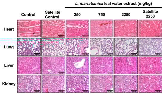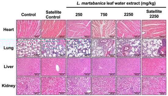At the end of the study, according to both the WHO and OECD guidelines, histopathological assessments of the internal organs were conducted in the treated groups compared with those of the control group. All the internal organs, especially the heart, liver, kidneys, and lungs, revealed no abnormalities in cell morphology when compared between the control and the treated groups. The results of the present study consisting of body weight, organ weight, animal behaviors, hematological and serum biochemistry assessments, gross pathology, and histopathology assessments, when processed together, indicated that the L. martabanica water leaf extract did not cause chronic toxicity in rats.