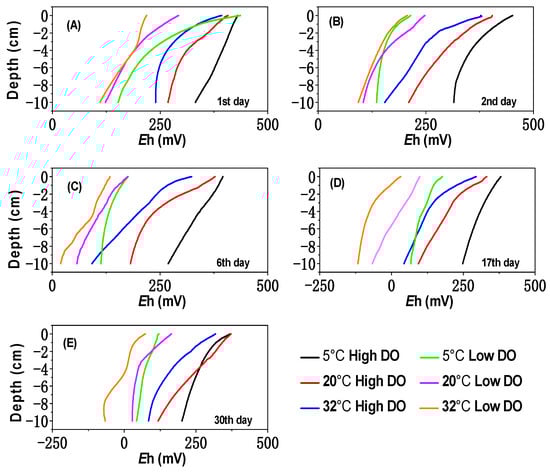 The effect of temperature on Eh of sediments under differing DO conditions on (A) 1st day, (B) 2nd day, (C) 6th day, (D) 17th day, and (E) 30th day.