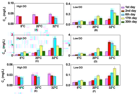 Low DO conditions were favorable for the reduction reaction of Fe/Mn-OOH [], leading to an evident enhancement in the levels of dissolved Fe and Mn in the overlying water (Figure 2). After cultivation, the contents of dissolved Fe in the overlying water at 5 °C, 20 °C, and 32 °C were 0.064 mg/L, 0.13 mg/L, and 0.18 mg/L, respectively, whereas the concentrations of dissolved Mn were 0.36 mg/L, 0.82 mg/L, and 1.01 mg/L, respectively. As the temperature increased, there was a corresponding increase in the migration rate of dissolved Fe and Mn from the pore water to the overlying water. Therefore, the maximum concentrations of dissolved Fe and Mn in the overlying water were observed earliest at 32 °C (Figure 2). The peak value of dissolved Fe reached 0.28 mg/L on the 6th day under the condition of low DO, while the peak values of dissolved Mn were 1.70 mg/L on the 6th day under high DO conditions and 2.65 mg/L on the 2nd day under low DO conditions.