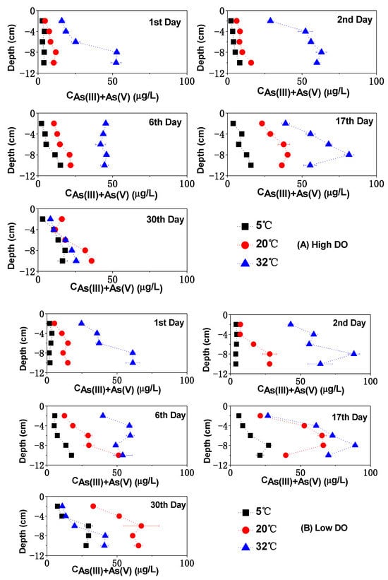 The impact of temperature on As (III) + As (V) concentration in the pore water under different DO conditions: (A) high DO, (B) low DO.