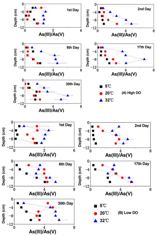 The impact of temperature on As (III)/As (V) ratio of pore water under different DO conditions: (A) high DO, (B) low DO.