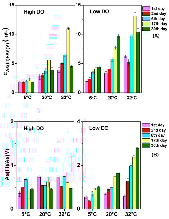 The impact of temperature on As (III) + As (V) content (A) and As (III)/As (V) (B) of superjacent water under different DO conditions.