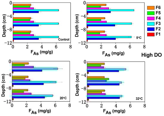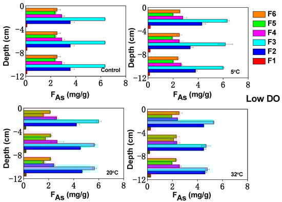 From the sediment profile distribution, it can be seen that after high DO cultivation at 5 °C and 20 °C, the contents of F3 and F4 in the upper sediment layer increased. This was likely because high DO conditions favored the transformation of exchangeable As into Fe/Mn-OOH-bound As. In the middle and lower sediment layers, the Eh were relatively low, and F3 and F4 underwent reduction, resulting in varying degrees of decrease. Under low DO cultivation conditions at 5 °C and 20 °C, Fe/Mn-OOH-bound As underwent reduction and dissolution, which resulted in the liberation of As from the sediment.