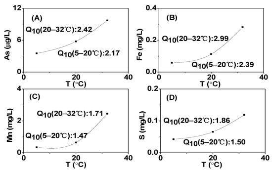 The Q10 values were employed to further investigate the significant impact of temperature on both microbial respiration and the mobilization rates of redox-sensitive species (Figure 7). From Figure 5, it can be seen that the release rate of As was the fastest during the 2nd to 6th day under low DO conditions, so the Q10 analysis was conducted for this period, revealing a strong temperature dependence of As release from the sediment. The Q10 values for As, Fe, Mn, and S increased from 5 °C to 20 °C, with values of 2.17, 2.39, 1.47, and 1.50, respectively. As the temperature further increased from 20 °C to 32 °C, the Q10 values for As, Fe, Mn, and S increased to 2.42, 2.99, 1.71, and 1.86, respectively. It can be observed that the Q10 value of As was synchronized with the Q10 values of the other redox-sensitive elements, consistent with previous research findings [,]. Fe(III) and Mn oxides were considered important hosts for As in the sediments of Lake Taihu [], so the reduction dissolution of As-bearing Fe(III) and Mn minerals might also play a role in As migration. The concentration of As was significantly correlated with Fe2+ and Mn2+ (p < 0.01) (Table S2). Therefore, under low DO conditions, with the increase in temperature, the reduction of Fe/Mn-OOH and sulfates was enhanced, leading to a significant promotion of dissolved As. The Q10 values of As showed that a small increase in water temperature above about 20 °C might significantly elevate As concentrations in Taihu Lake. The findings suggest that temperature-dependent reduction processes within the hyporheic zone’s benthic sediments played a crucial role in controlling As mobility across various spatial and temporal scales, aligning with our field observations at both local and regional levels [].