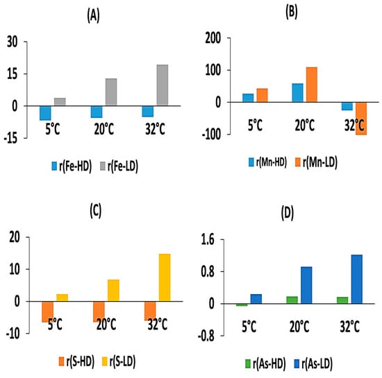 The temperature dependence of sediment As release ((A) and related elements (B) Fe, (C) Mn, and (D) S) under low DO culture.