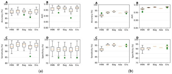 The ensemble of model predictions optimizes the predictive performance of models and was employed in the binary classification models. The ensemble prediction, as we described previously [45,47,48], was used to calculate the final prediction based on the prediction results from HNN, RF, bagging, and AdaBoost.