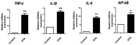 We then evaluated the mRNA levels of several inflammatory markers, such as TNF-α, IL-1β, IL-6, and NF-kB, using RT-qPCR to determine the effect of OTA treatment on inflammation in IPEC-J2 cells. The results showed that OTA treatment significantly increased mRNA levels of TNF-α, IL-1β, IL-6, and NF-kB compared to the control cells (Figure 2).