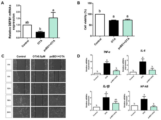 Ochratoxin A reduces the expression level of DEFB1, and the effect of DEFB1 increases cytotoxicity, cell migration, and inflammatory markers. (A) Relative mRNA levels of DEFB1 following OTA 5.5 μM treatment in IPEC-J2 cells and pcBD1 cells compared with the control group. (B) Analysis of cell viability following OTA 5.5 μM treatment in IPEC-J2 cells and pcBD1 cells compared with the control group. (C) Effects of OTA treatment on cell migration in IPEC-J2 cells and pcBD1 cells at 0, 6, 12, 18, and 24 h. (D) The relative mRNA levels of inflammatory markers (TNF-α, IL-1β, IL-6, and NF-kB) following OTA 5.5 μM treatment in IPEC-J2 and pcBD1 cells compared with the control group. Lowercase letters (a, b) denote statistical differences between the control and the treatment groups. Error bars represent the standard errors (SEs) of three independent experiments.