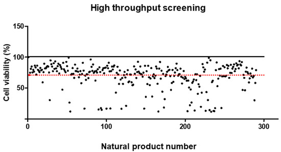 For the HTS assay, 288 natural products were provided by the National Institute for Korean Medicine Development (Gyeongsan, Republic of Korea). All products were diluted to 1 mg/mL using DMSO. IPEC-J2 cells were grown at 1 × 104/100 µL in 96 wells for 33 h and incubated with DMEM overnight. The cells were treated with a mixture of OTA (5.5 μM) and natural products at a final concentration of 20 ng/µL for 24 h. After treatment, 10 µL of EZ-Cytox was added to each mixture, and the reaction was allowed to proceed for 2 h. To evaluate absorbance between reactions, dye absorbance was measured by subtracting the background reading at 600 nm from that at 450 nm using a GloMax Discover Multi-Microplate Reader.