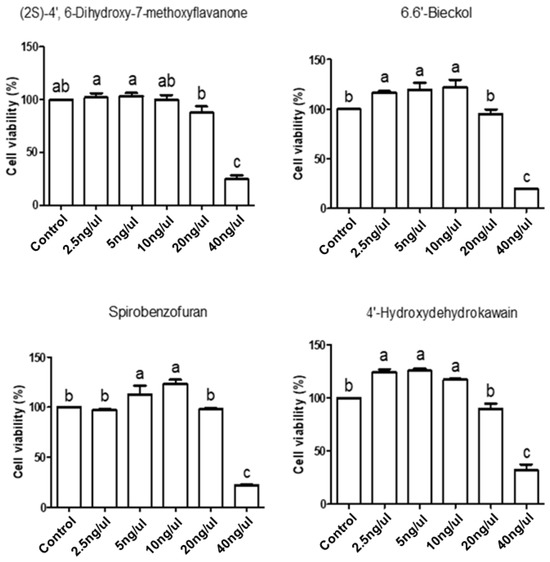 Analysis of cell viability using four candidate natural products in IPEC-J2 cells. IPEC-J2 cells were treated with various concentrations (2.5 ng/μL, 5 ng/μL, 10 ng/μL, 20 ng/μL, and 40 ng/μL) of (2S)-4′,6-Dihydroxy-7-methoxyflavanone, 6,6′-Bieckol, Spirobenzofuran, and 4′-Hydroxydehydrokawain for 24 h. Lowercase letters (a, b, c) denote statistical differences between the control and the treatment groups. Error bars represent the standard errors (SEs) of three independent experiments.