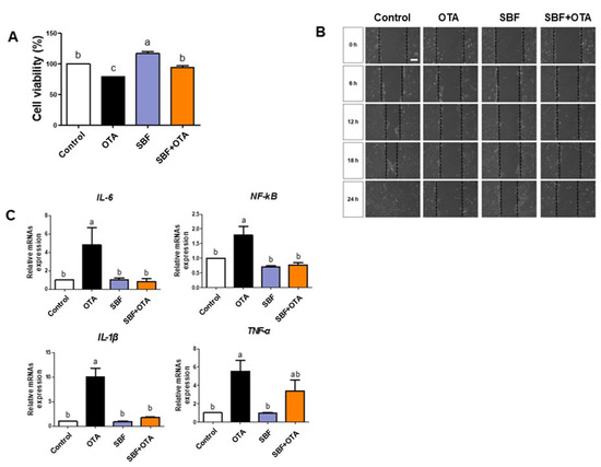 We measured cell viability, cell migration, and the expression of inflammatory markers to determine whether Spirobenzofuran can regulate OTA toxicity in IPEC-J2 cells. The cell viability results exhibited that Spirobenzofuran, whether administered individually or in combination with OTA, significantly increased cell viability compared to OTA-treated cells (Figure 7A). Moreover, the wound width of cells treated with Spirobenzofuran individually or cotreated with OTA showed slight reductions compared to OTA-treated cells (Figure 7B). Finally, the mRNA expression of the inflammatory markers TNF-α, IL-1β, IL-6, and NF-kB was significantly decreased in cells treated with Spirobenzofuran, either individually or with OTA, compared to OTA-treated cells (Figure 7C).