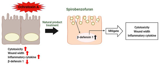 Our study showed that OTA treatment has adverse effects, such as cytotoxicity, decreased cell migration, and the induction of inflammatory markers in porcine intestinal epithelial cells. However, we found that OTA-induced inhibition of cell migration and the induction of inflammatory markers were modulated in pcBD1 cells, overexpressed DEFB1 cell lines (Figure 8). Based on these findings, Spriobenzofuran, a natural product selected through the HTS assay and identified for its DEFB1-inducing properties, was revealed to mitigate the harmful effects of OTA-exposed intestinal epithelium. Collectively, these data could be indicated to provide clues about porcine intestinal epithelium threatened by mycotoxin. Moreover, our study may help us understand and select candidate feed additives for the pig industry.