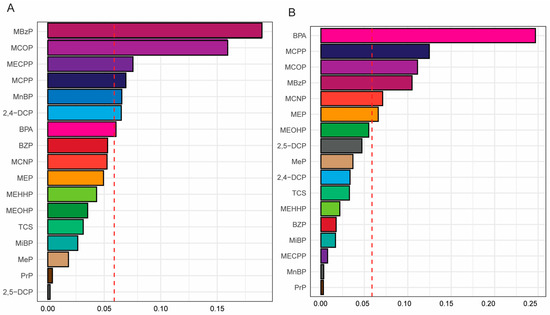 Weighted quantile sum (WQS) regression model index weight for a mixture of personal care product and plasticizing chemicals (PCPPCs) with short sleep duration among adults by gender-specific status. (A) Female. (B) Male. The red line indicates the cutoff point to discriminate the relative importance of the chemical. The model was adjusted for age, race, education, marital status, body mass index (BMI) [not adjusted for general obesity and no general obesity], waist circumference (not adjusted for abdominal obesity and no abdominal obesity), family income to poverty ratio (PIR), food insecurity, physical activity, log10 cotinine, and log10 creatinine.
