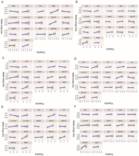 Moreover, the mixture of 17 PCPPCs was consistently positively associated with short sleep duration irrespective of gender- and obesity-specific differences (Figure 4), which was similar to the findings in the WQS regression model, except for those with no abdominal obesity, in which no statistically significant association was observed in the WQS regression model. In addition, we observed possibly significant interactions between chemicals in the mixture of PCPPCs; particularly, there were possible bi-interactions between MBzP and each of MCOP, MeP, MiBP, MEHHP, MCPP, BPA, and 2,5-DCP; MCOP and each of MiBP, MiBP, MeP, MEHHP, MCPP, BPA, and 2, 5-DCP; MeP and each of MiBP, MEHHP, MCPP, BPA, and 2, 5-DCP in females, and some of these bi-interactions were observed in participants with no general obesity and those with abdominal obesity (Figures S4–S9).