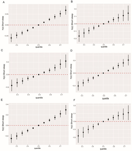 Univariate exposure–outcome function (95% credible interval) for personal care product and plasticizing chemicals (PCPPCs) with short sleep duration among adults by gender- and obesity-specific status. The function was estimated while fixing other PCPPCs at their median level. (A) Female. (B) Male. (C) General obesity. (D) No general obesity. (E) Abdominal obesity. (F) No abdominal obesity. The Bayesian kernel machine regression model was adjusted for age, gender (not adjusted for female and male), race, education, marital status, body mass index (BMI) [not adjusted for general obesity and no general obesity], waist circumference (not adjusted for abdominal obesity and no abdominal obesity), family income to poverty ratio (PIR), food insecurity, physical activity, log10 cotinine, and log10 creatinine.