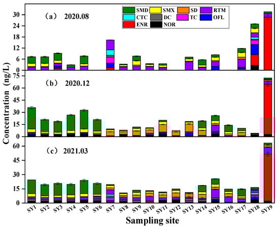 - Li, S.; Shi, W.; You, M.; Zhang, R.; Kuang, Y.; Dang, C.; Sun, W.; Zhou, Y.; Wang, W.; Ni, J. Antibiotics in water and sediments of Danjiangkou Reservoir, China: Spatiotemporal distribution and indicator screening. Environ. Pollut. 2019, 246, 435–442. [Google Scholar] [CrossRef] [PubMed]