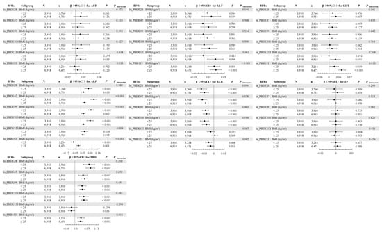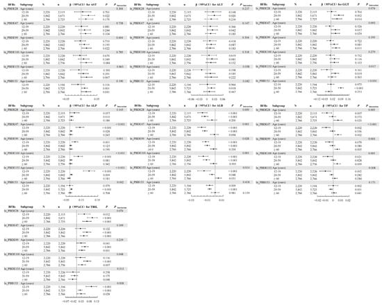 In the weighted linear regression, interactions were observed between BFRs and age groups for ALT, GGT, ALP, ALB, and TBIL (Figure 2); between BFRs and gender for AST, ALT, GGT, ALP, and ALB (Figure 3); and between BFRs and BMI for AST, ALT, ALP, ALB, and TBIL (Figure 4).