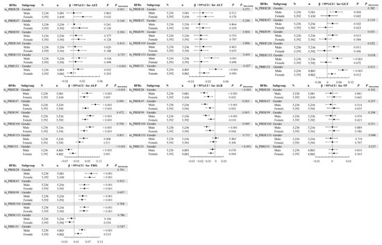 Associations of serum BFRs with LFTs stratified by gender. The model was adjusted by age (continuous), race (Mexican American, Other Hispanic, Non-Hispanic White, Non-Hispanic Black, Other Race—including multi-racial), BMI (<25 kg/m2 and ≥25 kg/m2), PIR (<1 and ≥1), creatinine (continuous), cotinine (continuous), time of blood draw (morning, afternoon, evening), and six-month time period when surveyed (November 1 through April 30, May 1 through October 31). “N” means total number. “n” means the number of BFR-positive subjects. “◆” means β value and line segment means 95%CI.