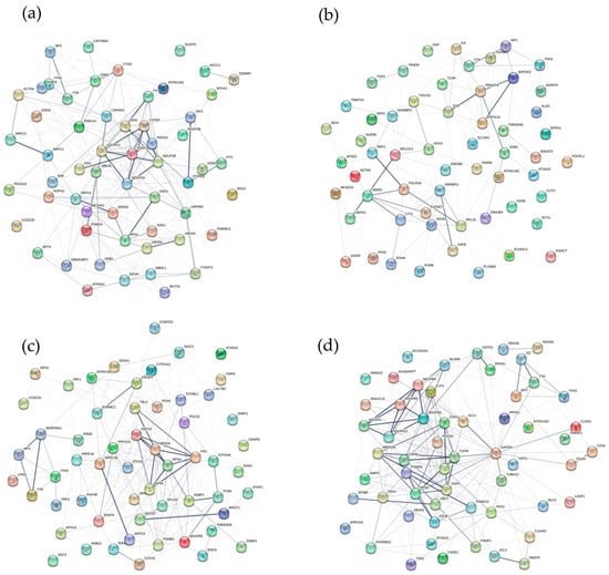 - Szklarczyk, D.; Kirsch, R.; Koutrouli, M.; Nastou, K.; Mehryary, F.; Hachilif, R.; Gable, A.L.; Fang, T.; Doncheva, N.T.; Pyysalo, S.; et al. The STRING Database in 2023: Protein-Protein Association Networks and Functional Enrichment Analyses for Any Sequenced Genome of Interest. Nucleic Acids Res. 2023, 51, D638–D646. [Google Scholar] [CrossRef] [PubMed]