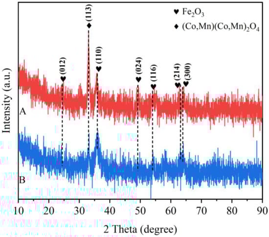 The crystalline structure of the catalysts was characterized by XRD, and the exposed crystal faces and crystal clusters of the catalysts were analyzed, as shown in Figure 1. The analysis of the spectra shows that there is one characteristic peak at 33.0° for both Sample A and Sample B, which corresponds to the (113) crystalline facet of (Co, Mn) (Co, Mn)2O4 (JCPDS PDF#18-0408) [,,], and there are five characteristic peaks at 24.2°, 35.9°, 49.1°, 54.1° and 64.1°, which correspond to the crystal facets of Fe2O3 (JCPDS PDF#85-0599) in the (012), (110), (024), (116) and (300) crystal planes; in addition, sample A also has one more characteristic peak at 62.8° than sample B, which corresponds to the (214) crystal plane of Fe2O3 (JCPDS PDF#85-0599) [,,]. Sample B has a similar peak position to sample A, but the peak corresponding to the crystal face is relatively high and narrow. Based on the XRD spectra of sample A, it can be seen that its crystallinity is lower than that of sample B, which favors the formation of more exposed planes and more lattice defects.