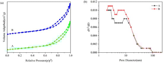 The specific surface areas and pore structures of catalysts are some of the influencing factors that affect the catalytic performance of catalysts []. The specific surface area and pore structure of each catalyst were tested using BET, and the relevant data are presented in Table 1. Figure 2a shows the N2 adsorption–desorption isotherms of each catalyst. It was obvious that the adsorption–desorption isotherms of all catalysts were typical type IV isotherms with H3-type hysteresis loops, indicating the presence of mesoporous structures in these samples. The non-coincidence of adsorption and desorption curves of isotherms at higher relative pressures is caused by the capillary condensation phenomenon [,]. Figure 2b shows the BJH adsorption pore volume–pore size distribution of each catalyst. Combined with Table 1, it can be seen that these samples have similar pore volume and pore size distributions, and the pore size is mainly concentrated in the mesopore range of 2–50 nm. The kinetic diameter of acetone is 0.45 nm, which belongs to the larger VOC molecules, and the mesopore size of the pores is favorable for the reaction []. As shown in Table 1, the specific surface area and pore volume are A > B, and the average adsorption pore size is A < B. The BET test results were different for Sample A compared with Sample B because both of them added different morphologies of Fe-MOF. Compared with sample B, sample A has a smaller particle size and more uniform dispersion, so the specific surface area of the catalyst is relatively high. The average adsorbed pore size of Sample A is relatively small (13.88 nm), which indicates that this sample has smaller pores and a poorer crystallinity. These properties promote the formation of lattice defects and increase the oxygen vacancy concentration []. Sample A has a larger BET-specific surface area (71.14 m2/g) and pore volume (0.24 m2/g), which is favorable for providing more activation sites during the catalyst reaction. For the catalyst, the larger specific surface area and pore volume enhanced the surface adsorption rate of the reactants. They provided a larger reaction space for the reaction process, which resulted in an improved VOC removal rate []. This is also in perfect agreement with the results of the subsequent photothermal catalysis performance tests.