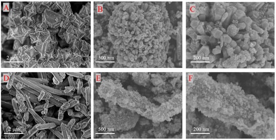 SEM images of Fe-MOF (octahedral shape) (A), Fe-MOF (rod shape) (D), Sample A (B,C), and Sample D (E,F).