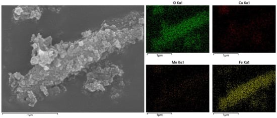 The morphology of each catalyst was investigated by scanning electron microscopy (SEM), as shown in Figure 3: A is the SEM image of Fe-MOF (octahedral shape), BC is Sample A, D is the Fe-MOF (rod shape) and EF is Sample B. The SEM images of the catalysts are shown in Figure 3. It can be seen that Sample A has a homogeneous spherical morphology with microspheres consisting of aggregated rods, which is changed from the octahedral shape of Fe-MOF when it is not loaded with Co, Mn; Sample C has a long rod shape consisting of nanospheres, which is not changed from the rod shape of Fe-MOF when it is not loaded with Co, Mn. SEM-EDS maps of Samples A and B are shown in Figure 4 and Figure 5, respectively. The elemental mapping of the two further shows that the elemental distribution of the catalysts is relatively homogeneous, and the three-dimensional structure of each catalyst has a high thermal stability.