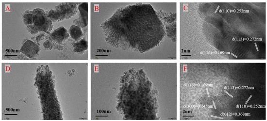 TEM was used to further investigate the morphology and microstructure of each catalyst. Figure 6 shows the HRTEM images of Samples A and B (ABC, DEF), respectively. As can be seen from the figures, the calculated plane spacings of the lattice fringes of Sample A were 0.169 nm, 0.252 nm and 0.272 nm, which matched with the (116), (113) and (110) planes of the spinel phase, and the plane spacings of the lattice fringes of Sample B were 0.145 nm, 0.196 nm, 0.252 nm, 0.272 nm and 0.368 nm, matching the (300), (116), (110), (113) and (012) planes of the spinel phase [,,]. The HRTEM test results are in good agreement with the SEM and XRD results.