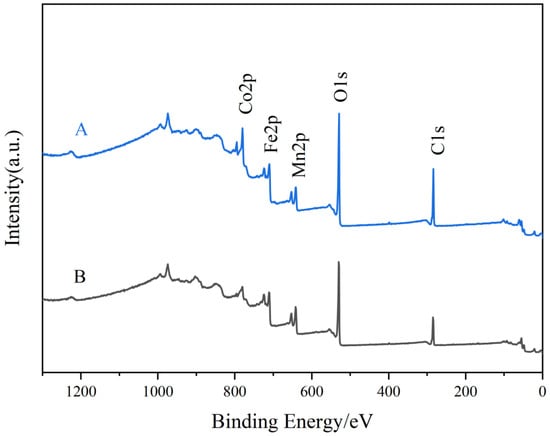 XPS characterization was used to analyze the surface elemental composition of the catalysts and the valence distribution of each element. Figure 7 shows the full spectrum of each catalyst. Figure 8 shows the XPS fine spectra of Co 2p, Mn 2p, O 1s and Fe 2p. The figure shows that Mn, Co, C, O and Fe are the main elements in the compositions of Samples A and B.