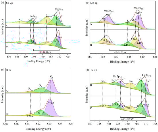 As shown in Figure 8b, Mn 2p is a spin-orbit double state consisting of Mn 2p1/2 and Mn 2p3/2, with a binding energy difference of about 11.7 eV between them, and the Mn 2p1/2 spectra of each catalyst consisted of two peaks of Mn4+ (653.0 eV) and Mn3+ (651.2 eV), and the Mn 2p3/2 spectra consisted of two peaks of Mn4+ (642.3 eV) and Mn3+ (640.9 eV) peaks. The failure to fit the Mn2+ peaks for Samples A and B may be due to the presence of MnOx, Co3O4 and FeOx interacting with each other through electron transfer. Similar to Co3+, the high valence state of manganese (Mn4+) favors the oxidation reaction of VOCs, and Mn4+ plays an important role in the oxidation reaction of VOCs [,,].