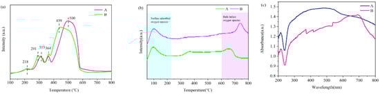 The redox properties of each catalyst were analyzed by H2-TPR and O2-TPD characterization. Figure 9a shows the H2-TPR plots of each catalyst, from which it can be seen that each catalyst exhibits two main reduction zones (200~350 °C, 350~600 °C), in which the reduction zone at 200~350 °C is mainly contributed by the reduction of MnO2 or Mn2O3 to Mn3O4 as well as the surface Co3O4 to CoO and the reduction of Fe2O3 to FeO, while the reduction zone at 350~600 °C is mainly contributed by the reduction of non-surface Co3O4 to CoO and the reduction of CoO to Co0 as well as the reduction of Mn3O4 to MnO2, and by the reduction of FeO to Fe0. It is clear from the observations that the peaks in the range of 100–200 °C are related to the reduction of surface oxygen species. The shaded area indicates that the peak area of Sample A is the largest, which suggests that more oxygen vacancies are formed on Sample A, which further promotes the catalytic reaction and, therefore, leads to a better low-temperature reduction capability [,]. In addition, the trend in the reduction capacity of each catalyst in the reduction zone coincides with the trend in the performance of each catalyst in photothermal-catalyzed acetone and NO conversion.