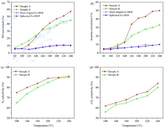 All the catalysts prepared above were applied in a photothermal co-catalytic reaction system under UV irradiation to investigate the photothermal catalytic performance of the samples obtained by different preparation methods. In this system, NO was used as the oxidant and acetone as the reductant. The prepared samples A and B were used as the catalysts. The simultaneous conversion of NO and acetone was achieved without additional NH3 flux, and the removal rates of NO and acetone are shown in Figure 10a,b, respectively. Meanwhile, the conversion rates of NO and acetone by Fe-MOFs with different morphologies unloaded with Co and Mn are also reflected in Figure 10a,b. From the figure, it can be seen that the removal of NO and acetone by the two catalysts without loading of Co and Mn is not much different, which is around 10%, and the performance of the catalysts is poor. However, the catalytic performance of the loaded catalyst was significantly improved by the introduction of Co and Mn elements. It can be assumed that the simultaneous presence of Co and Mn can produce a synergistic effect, thus improving the performance of the catalyst. This indicates that Co3O4 and MnOx are the key factors that allow this type of catalyst to have a catalytic conversion ability. The used catalyst still had a relatively high activity, suggesting the structure of the catalyst was not changed after activity evaluation (Figure S1). The conversion of NO and acetone by sample B was slightly higher than that of sample A at 80–140 °C. Also, in conjunction with Figure 9b,c, it can be argued this may be due to the fact that the light absorption ability of Sample B and its own oxygen lattice defects are superior to those of A at this stage, which is the main reason affecting the photothermal catalytic performance of the catalysts at this stage. With the increase in temperature, the conversion of NO and acetone by Sample A gradually increased, which was higher than that of Sample B. Sample A had a higher percentage of Co3+, Mn4+ and Fe2+ atoms and a higher content of O2 ads compared to Sample B, which was favorable for the oxidation reaction in this system. Hence, the performance of this catalyst was better than that of Sample B as a whole [].