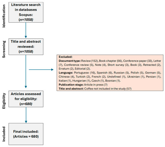 The search for articles on chemical hazards associated with coffee was performed using the Scopus database, adhering to the PRISMA search methodology [10,11,12,13]. The search field chosen was “Title, Abstract, Keywords” and the keywords used were “coffee” AND “chemical” AND “hazard” OR “risk” OR “contaminant” OR “toxic” OR “pollutant”. The temporal scope of the search was defined from the year 1949 up to 2024 (as of 15 April 2024). To refine the search results, records were filtered to include only “article” type publications that were available in full text, published in English, and at the final stage of publication. This comprehensive search strategy resulted in the selection of 680 documents, constituting the raw data for the present bibliometric analysis, Figure 1.