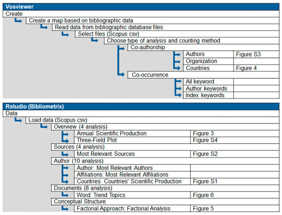 The processing and analysis of the information was carried out using VOSviewer (Version 1.6.20) and the R software combined with the Bibliometrix package (Version 4.3.3). Both programs are based on the “.csv” file obtained from the Scopus database. Figure 2 delineates the various bibliometric analyses possible through these applications, specifically highlighting the ones employed in this study, alongside the resultant figures obtained for each analysis.
