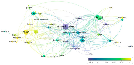 Research on chemical hazards in coffee has been conducted across 78 countries. Leading the way in terms of the number of articles produced are China (with 464 publications), Brazil (with 332 publications), and the USA (with 307 publications) (Figure S1). Additionally, Figure 4 provides a visual representation of the countries with the highest publication counts (indicated by larger circle sizes), the evolution of these publications over time (indicated by colour changes), and the collaborative networks between countries (shown as lines connecting circles).